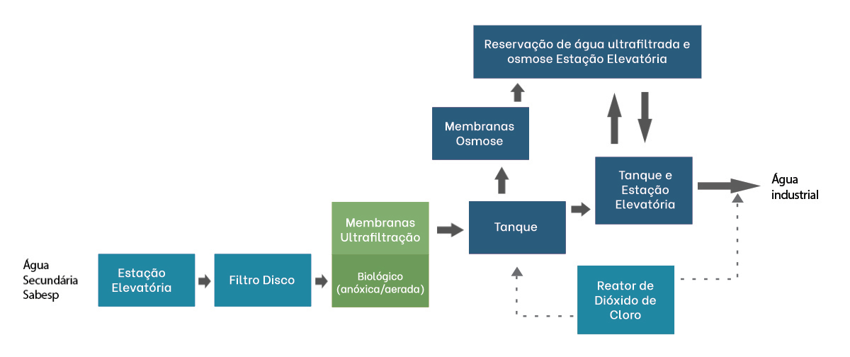 O processo começa quando a planta recebe o efluente secundário da SABESP a uma taxa de capacidade nominal de bombeamento de 750 l/s. O efluente passa pela primeira operação unitária de filtração, por meio de uma bateria de filtros tipo disco, com taxa de filtração da ordem de 400 micras.
